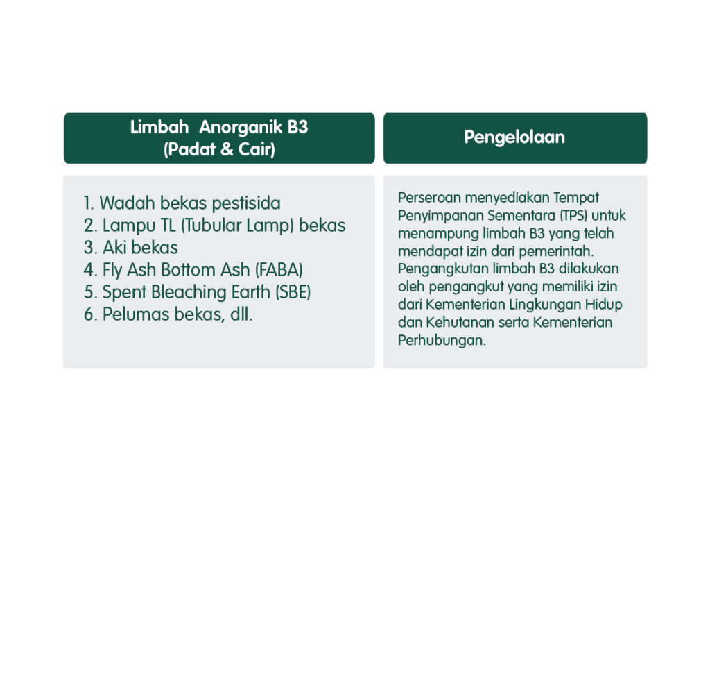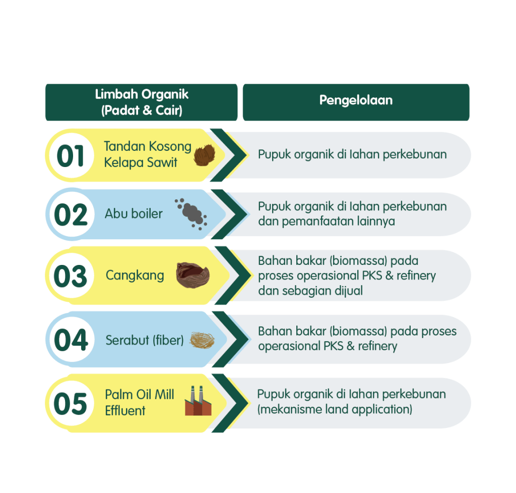 Perseroan berkomitmen untuk tidak hanya melakukan pengelolaan dan pengolahan limbah namun juga terus berupaya untuk melakukan pengurangan limbah yang dihasilkan dari operasional perkebunan dan PKS dengan prinsip produksi bersih melalui pemanfaatan kembali limbah sesuai konsep 5R (reduce, reuse, recycle, refine & retrieve to energy). Pengelolaan dan pemanfaatan limbah dilakukan secara mandiri oleh Perseroan untuk mendukung terciptanya kelestarian lingkungan dengan mempertimbangkan kelayakan secara ekologis, ekonomis dan dapat diterima oleh masyarakat sesuai dengan peraturan dan perundang-undangan yang berlaku. Perseroan telah menerapkan prosedur pengelolaan limbah yang sesuai untuk semua limbah berbahaya dan domestik serta tindakan mitigasi dan pencegahan untuk mengurangi risiko pencemaran lingkungan. Jenis limbah produksi yang ada di Perseroan dan pengeloannya adalah: